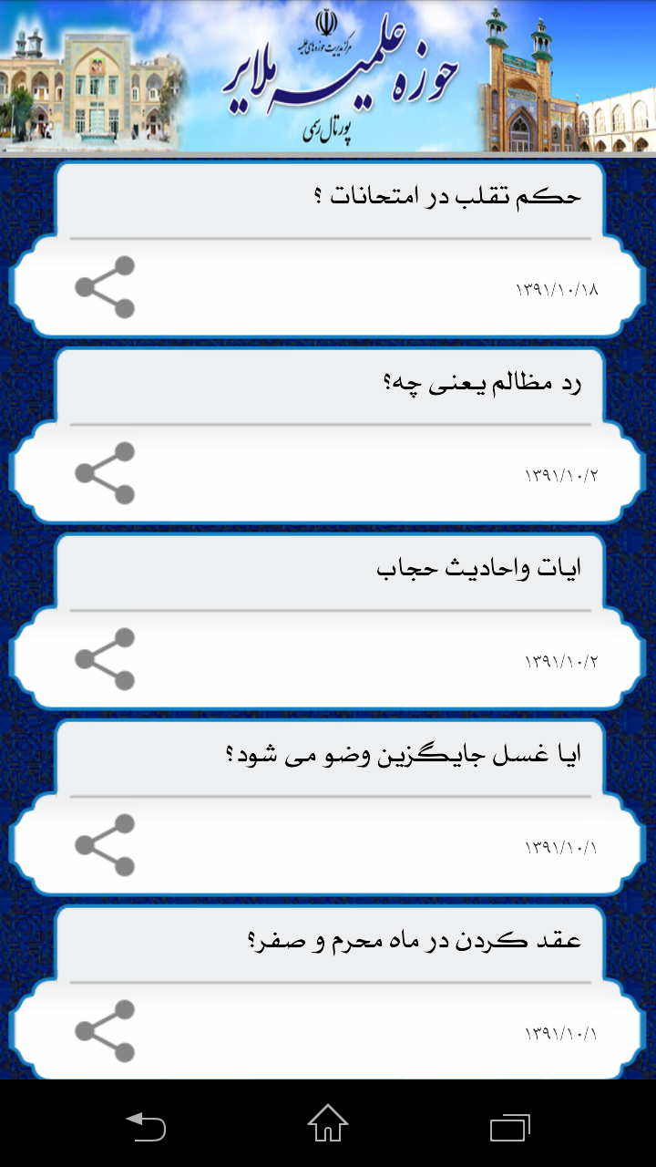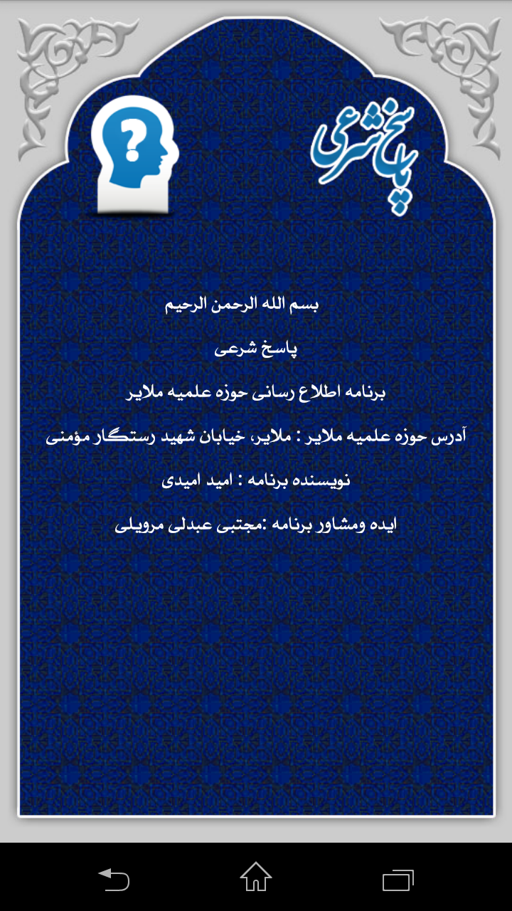 اخیراً برنامه ای برای توزیع رایگان به سفارش حوزه علمیه ملایر نوشتم به نام پاسخ شرعی. در این برنامه میتونید علاوه بر مشاهده مطالب سایت این حوزه، سوالات اعتقادی و شرعی خودتان را توسط سه روش پست الکترونیکی، تماس تلفنی و پیامک برای حوزه ارسال کنید و پاسختان را دریافت کنید. در ادامه میتوانید تصاویر محیط برنامه را ببینید و همچنین این برنامه را دریافت کنید.