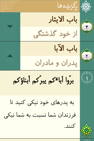 - قابلیت برگزیدن احادیث مورد دلخواه و ارسال آنها با پیامک