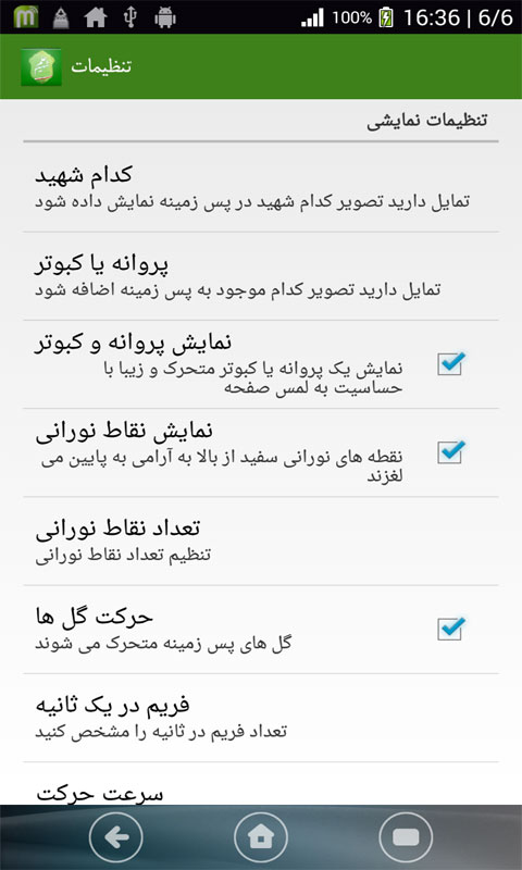 در تنظیمات برنامه تصویر شهید قابلیت انتخاب دارد. همچنین می توانید این انتخاب را بر عهده برنامه بگذارید.